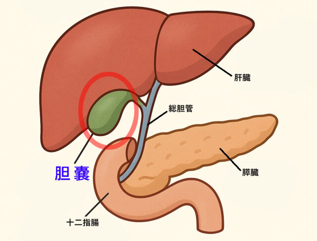 胆嚢(たんのう)は、肝臓で作られた胆汁を一時的に貯める袋状の臓器です。