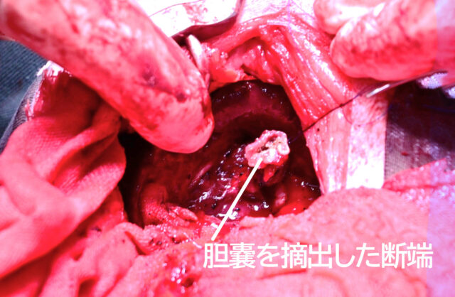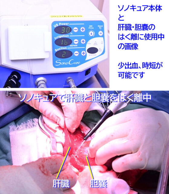 手術では、胆嚢は膨らみ、内部にはやや濁った胆汁が充満していました。幸い、周囲の組織には炎症による癒着はあまり見られませんでした。手術に当たってはソノキュア(リンク)を用い慎重に剥離して胆嚢を摘出しています。