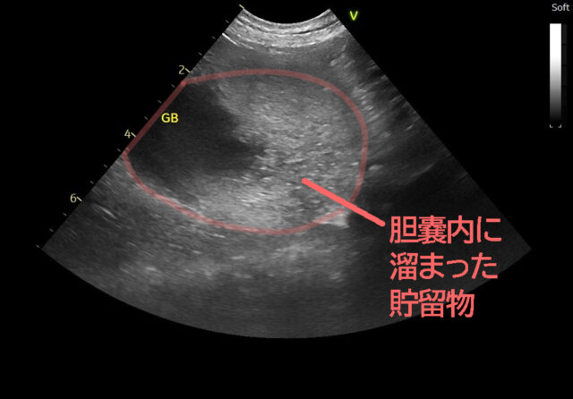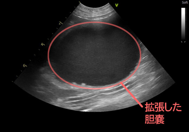 さらに超音波検査を行うと、下の画像のように、胆嚢は拡張し、内部の胆汁は濃く見える像が確認されました。