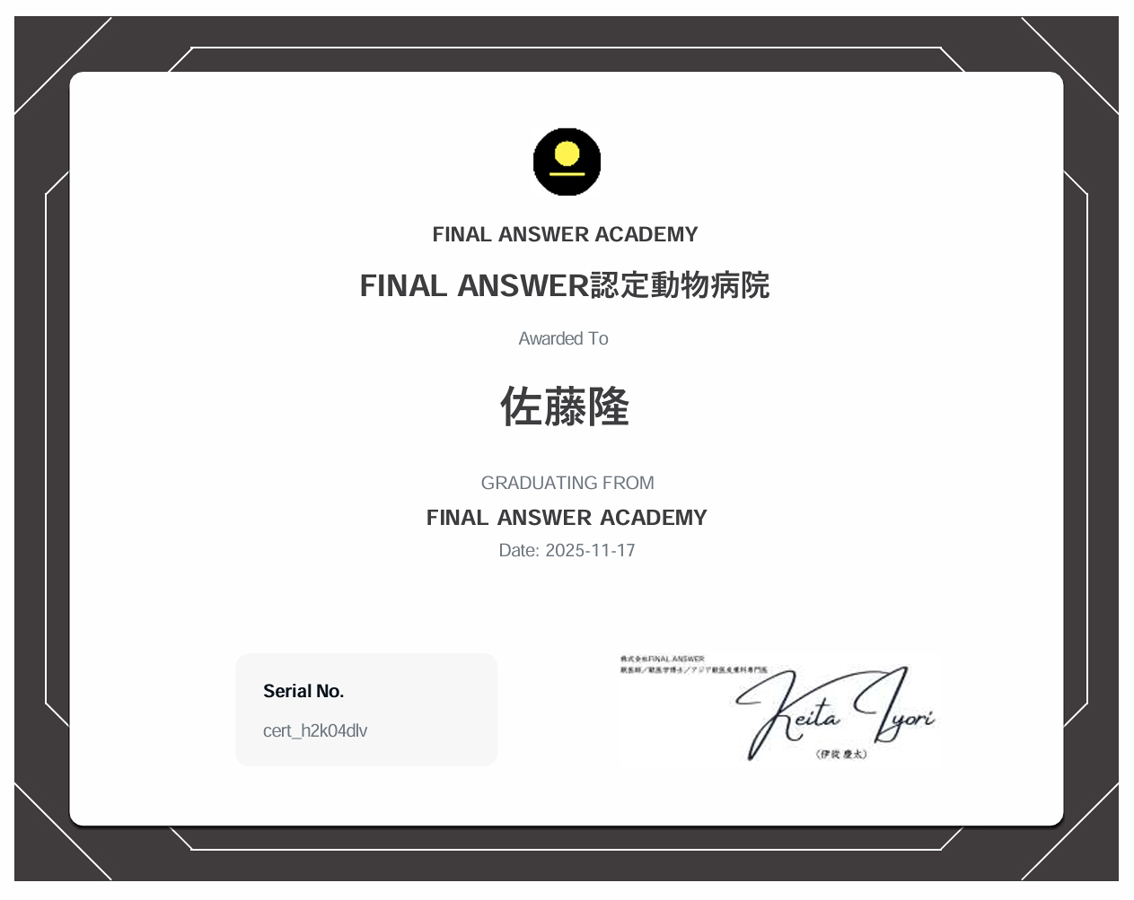 このたび当院は、所定の講習および研修を修了し、FINAL ANSWER認定動物病院として登録されました。