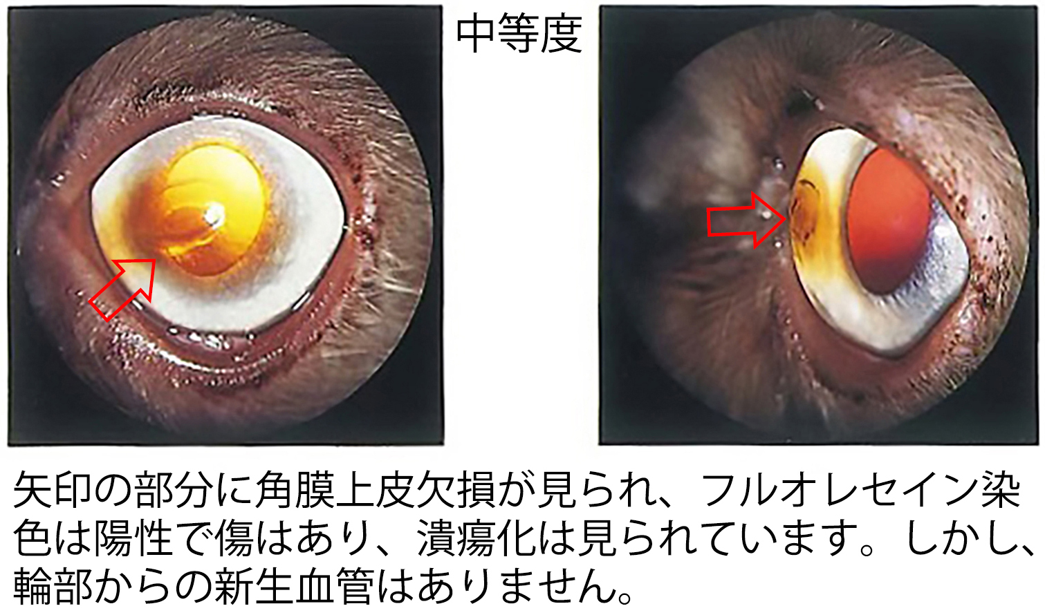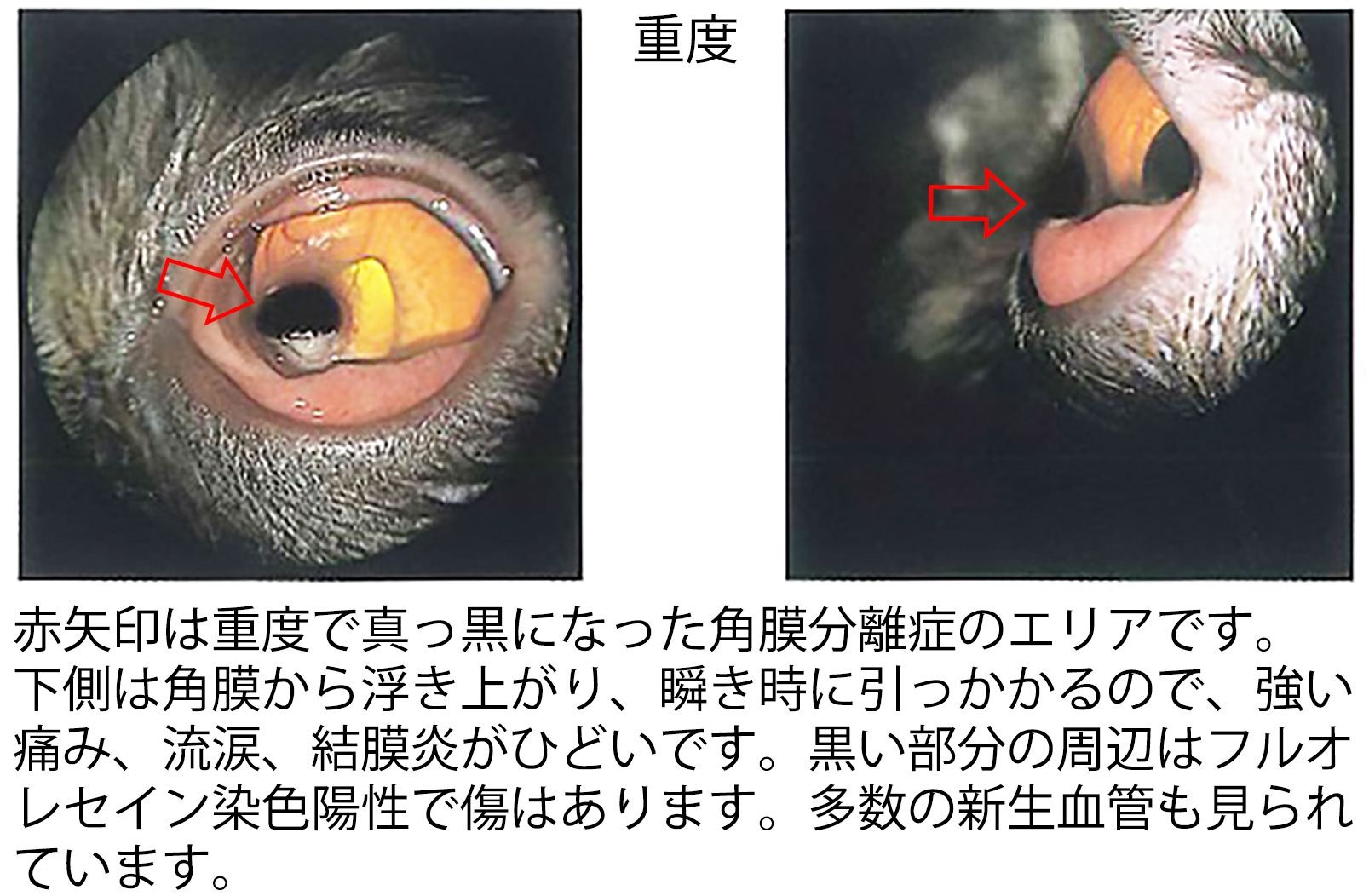 病変が進行すると角膜上皮は剥離し、フルオレセイン染色で陽性となることから、角膜潰瘍の形成が確認されます。