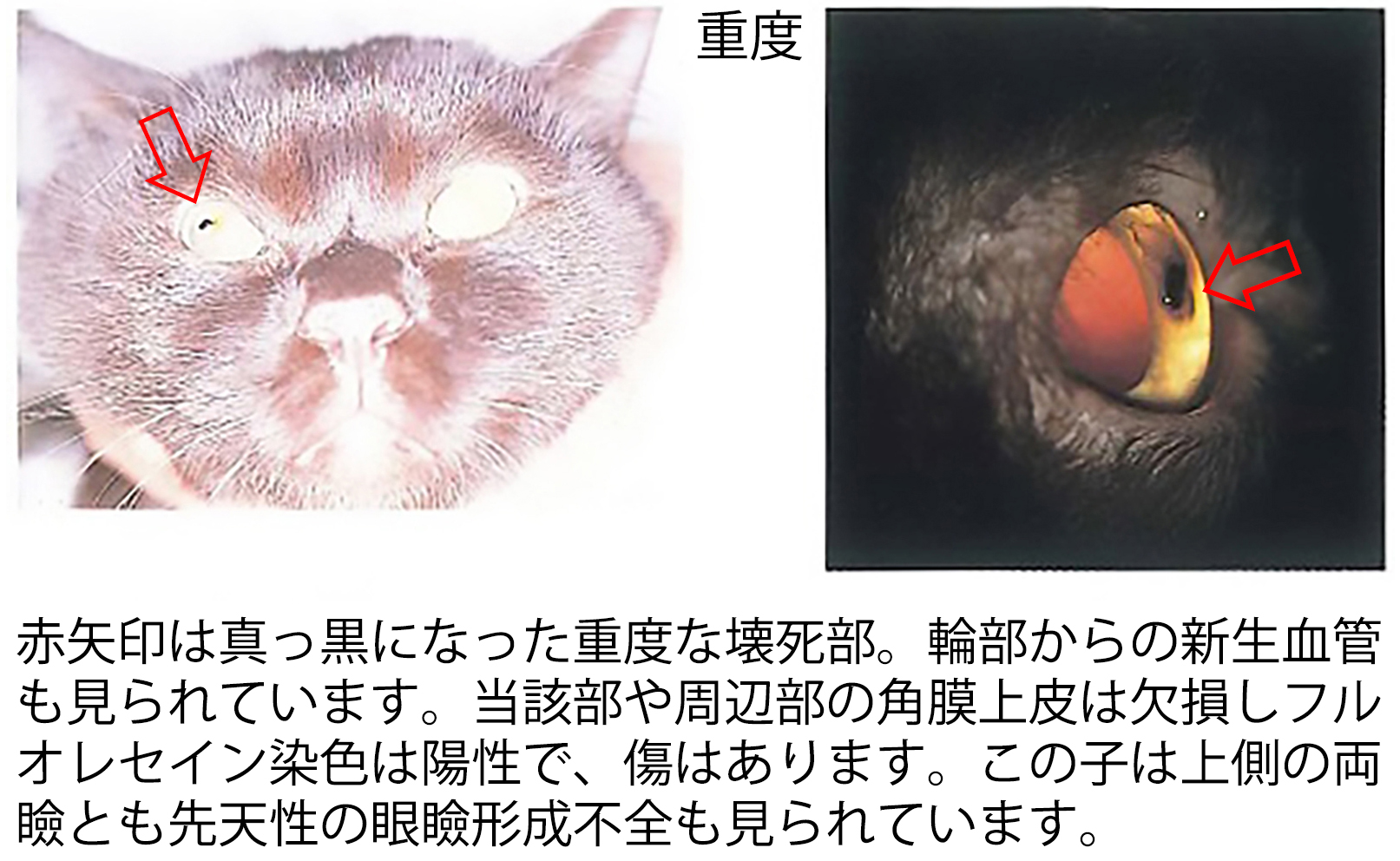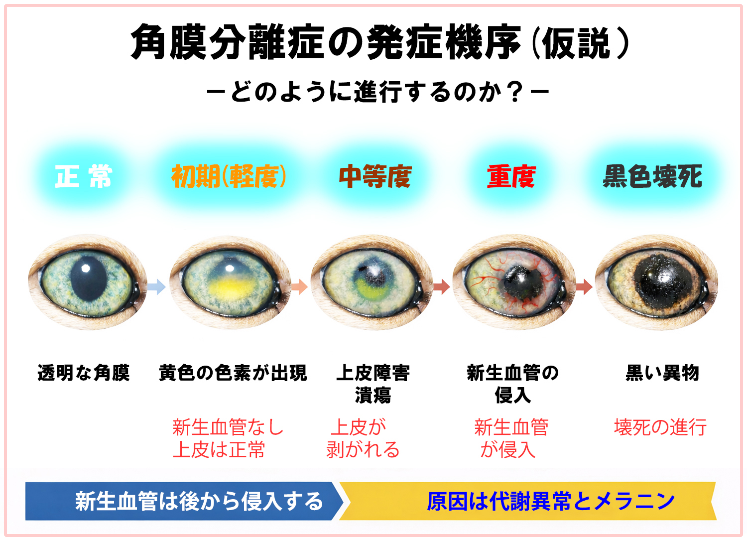 その後、病変の進行に伴い角膜上皮障害や潰瘍化が生じ、さらに進行した症例で新生血管の侵入が認められるようになりました。これらの経過から、新生血管は発症の一次的要因ではなく、病変進行に伴う二次的反応である可能性が示唆されます。