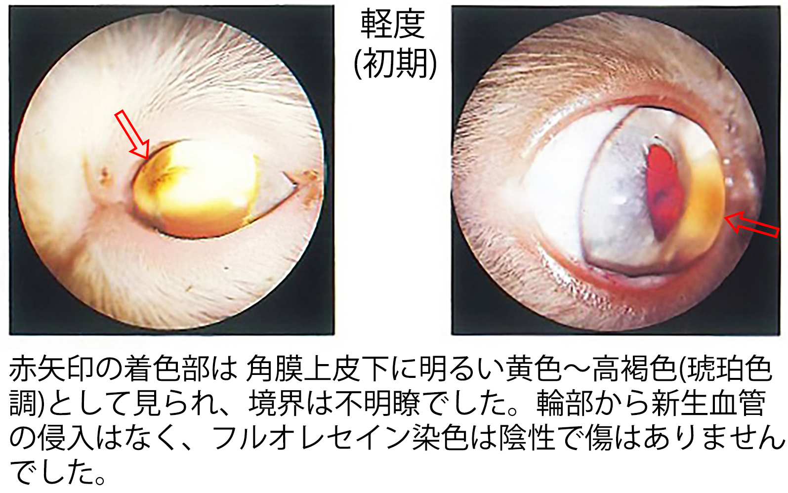 当院で観察した症例では、初期病変として角膜上皮下に黄色〜黄褐色(琥珀色調)の変化が認められました。この段階では角膜上皮は保たれ、輪部からの新生血管侵入も確認されませんでした。