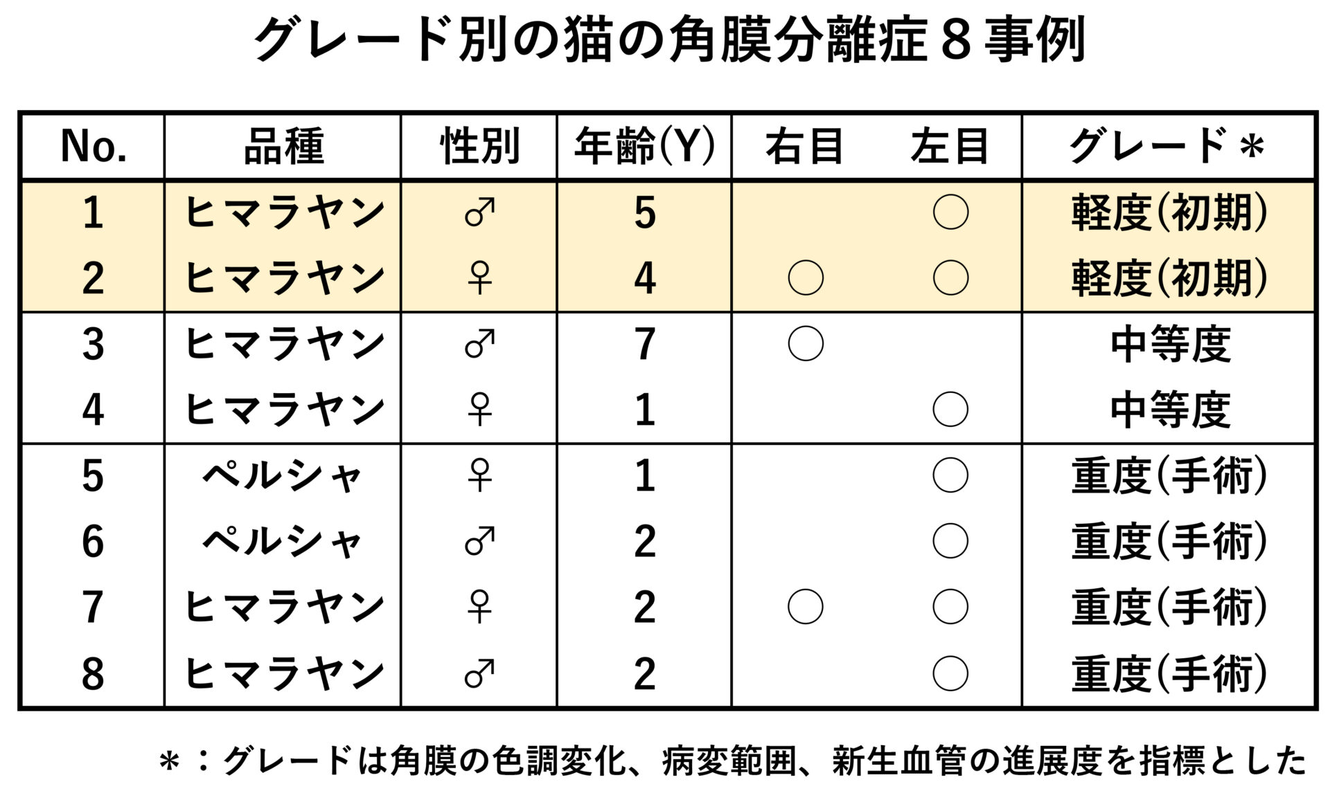 ヒマラヤン6例、ペルシャ2例の計8例でした。年齢は1~7歳で、すべて室内飼育でした。性別はオス4例、メス4例、片眼性6例、両眼性2例でした。