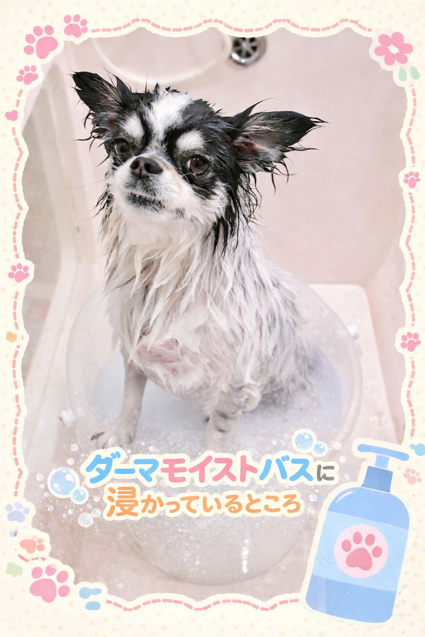 ダーマモイストバスは皮膚に必要なうるおいを補い、皮膚バリアの回復をサポートする保湿剤です。仕上がりは、被毛はふんわり、皮膚はしっとりとなります。 下の写真はダーマモイストバスに浸っているところです。
