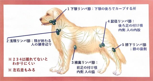 体表の代表的なリンパ節は①下顎リンパ節、②浅頸リンパ節、③腋窩リンパ節、④鼠経リンパ節、⑤膝下リンパ節の5ヵ所にあります。リンパ節は豆粒のような形をしていて、①下顎リンパ節と⑤膝下リンパ節以外は異常がなければ(健康時は)触っても分かりにくいとされています。しかし、リンパ腫や悪性腫瘍などが原因で大きくなると、触っても分かるくらいにグリグリ感が出てくることがあります。これらの部位を良く覚えておくと早期発見につながって、治療の幅も広がる可能性があります。早期発見のカギは、日常生活の中にあり、撫でたり、スキンシップをとりながら、大きくなっていないか、いつもと違うところがないかを確認してあげましょう。ちょっとした変化に気付くことが出来るのは毎日一緒に過ごしている飼い主様です!