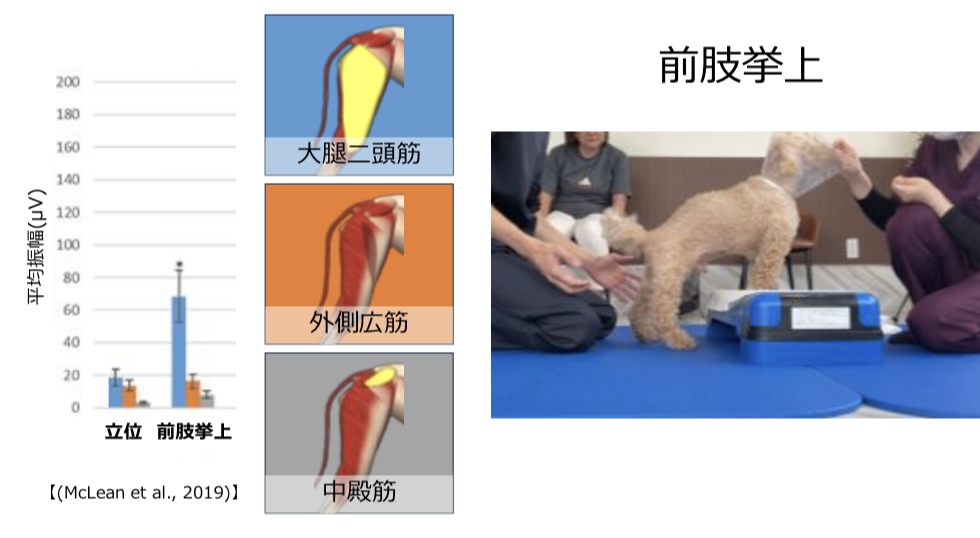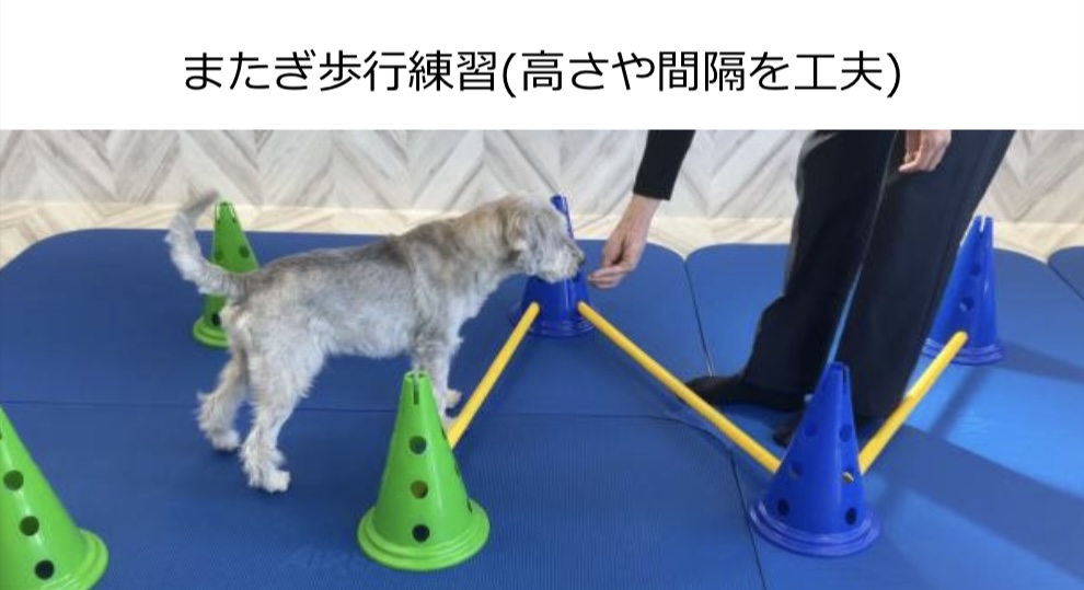 速度を上げて歩く(速歩)<前肢挙上<障害物乗り越え<後肢二足歩行と難易度を上げていくことによって、より筋肉に負荷がかかるようになります