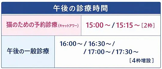 2026年より日曜日午後の診療について、一般診療枠の増設と猫のための予約診療(キャットアワー)の変更を行います。
