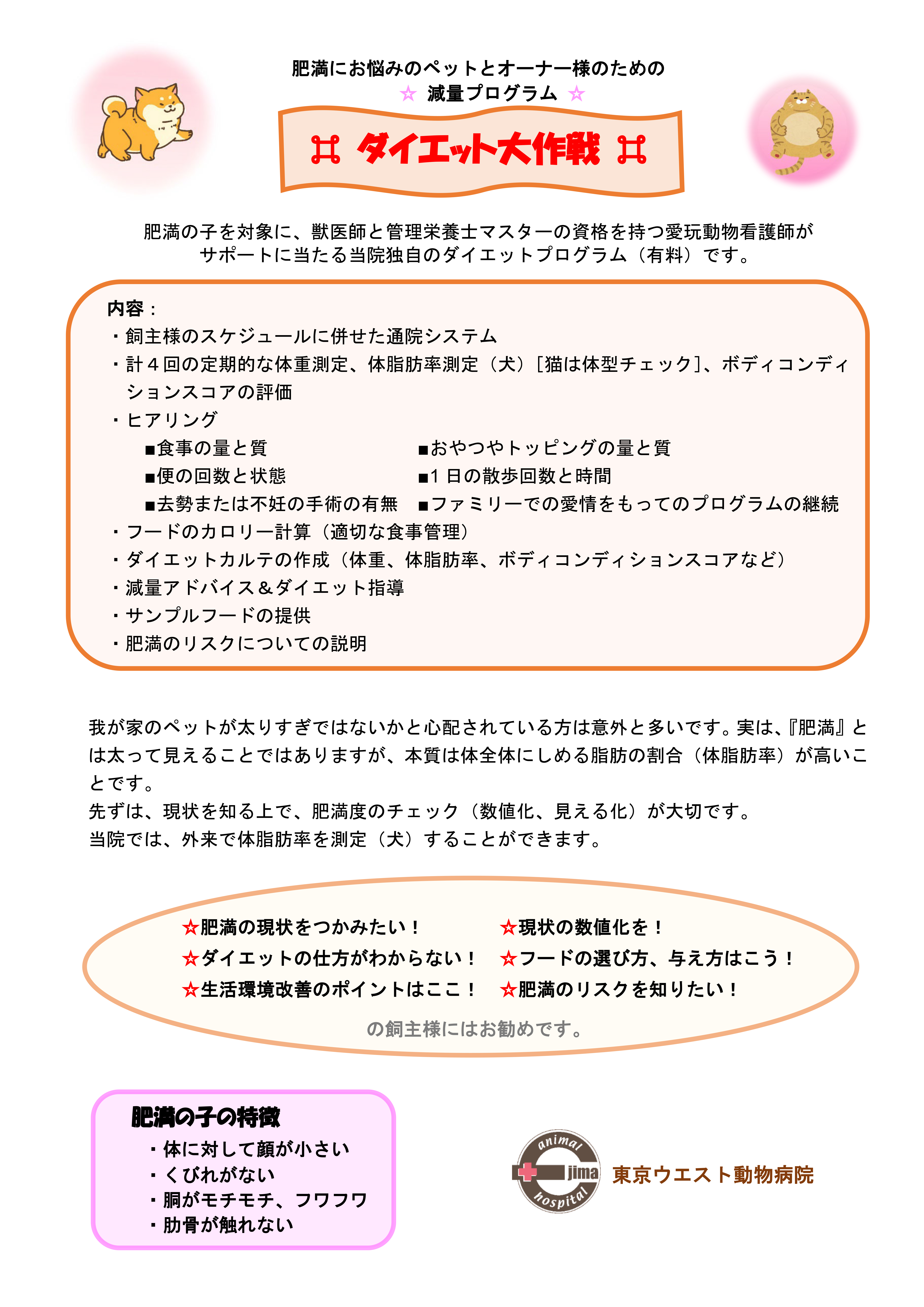 また、愛犬の肥満に対して、肥満対策プログラム-ダイエット大作戦を提供しています。